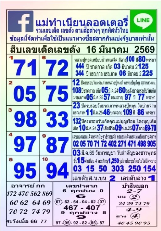รวมแนวทางหวยรัฐบาล งวดวันที่ 16 มีนาคม 2569 เจ้าพ่อ เจ้าแม่ จากสำนักดัง